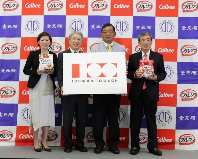 カルビーフルグラ事業本部の展望について藤原かおり(カルビー株式会社 執行役員 フルグラ事業本部 本部長)は、「今回の順天堂大学との共同研究講座の開設を皮切りに、『100年朝食プロジェクト』を始動します。本プロジェクトでは、臨床研究によりグラノーラ朝食の健康価値の確立を目指します。そして日本国内の50代以上の需要を喚起、アジア地区のグラノーラ朝食の需要を創出することで、国内・海外で1,000億円の事業規模を目指します。また、今回のグラノーラ朝食の臨床研究の成果をエビデンスとして生み出し、それらを活用した製品開発やプロモーション活動の展開も視野に入れています。」と説明しました。