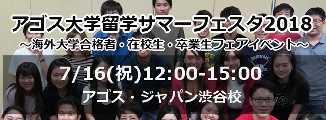 海外トップ大学・大学院留学準備指導校を運営する株式会社アゴス・ジャパン(代表取締役:横山 匡、本社:東京都渋谷区)は、2018年7月16日(月・祝)に、ハーバード大学、ブラウン大学、スミスカレッジ、カールトンカレッジ等、欧米総合大学・リベラルアーツカレッジトップ校に現在海外大学に留学中の在校生、今秋から進学する学生が一堂に会する「アゴス大学留学サマーフェスタ2018」を開催いたします。