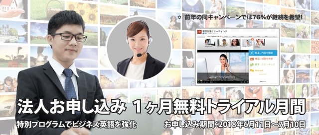 オンライン英語学習サイト『EnglishCentral』を提供する株式会社EnglishCentral(本社:東京都台東区、代表取締役社長: 松村 弘典、以下、イングリッシュセントラル)は、2018年6月11日から7月10日までにお申し込みを頂いた法人向けに、「EnglishCentralビジネスプレミアムプラン」(以下、本プラン)を1ヶ月間無料でお試しいただけるキャンペーンを実施いたします。このキャンペーンを皮切りに、全国200校以上の大学での採用と小中高での英語4技能(「読む」「書く」「聞く」「話す」)教材の提供に実績を持つイングリッシュセントラルは、ビジネスパーソンの英語力向上の支援へと本格的に乗り出します。