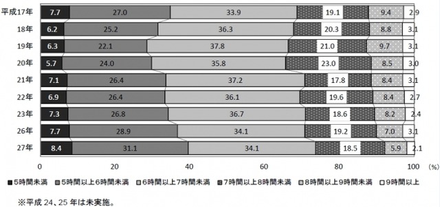 ■一日の平均睡眠時間の年次推移(20歳以上男女計)(平成17~27年)