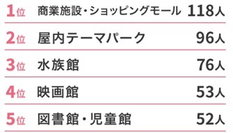 1位:商業施設・ショッピングモール118名、2位:屋内テーマパーク96人、3位:水族館76人、4位: