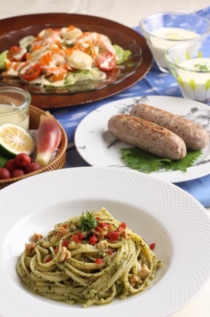 パスタソースの定番、ジェノベーゼは大葉の爽やかな香りが味の決め手。お肉料理も和のハーブを入れることでさっぱりとした一品になります。ピリッと辛みが効いたドレッシングを使ったサラダや爽やかなレアチーズケーキで、夏の食卓を彩りましょう。