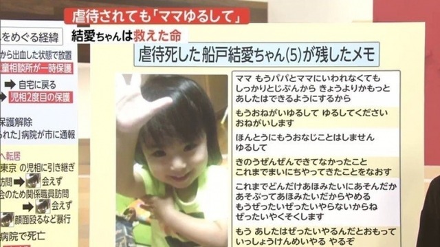 船戸結愛ちゃんは、朝4時に起き、「おねがい ゆるして」と覚えたてのひらがなで訴え、そして殺されていきました。