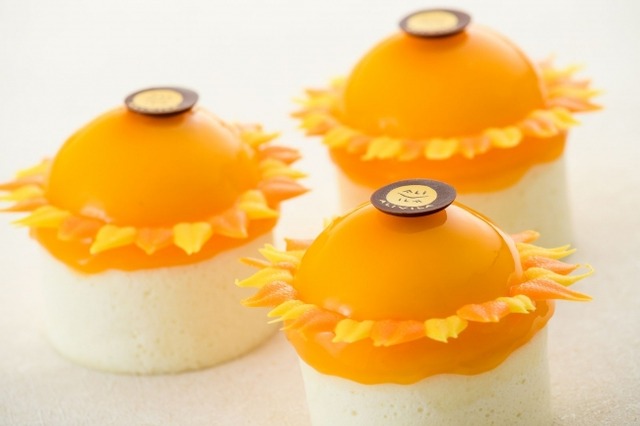 上の層は、マンゴームースの中心に、甘酸っぱいラズベリーとスポンジをとじ込め、マンゴーゼリーで包み込みました。アリビラカラーが目を引く夏にぴったりのケーキです。