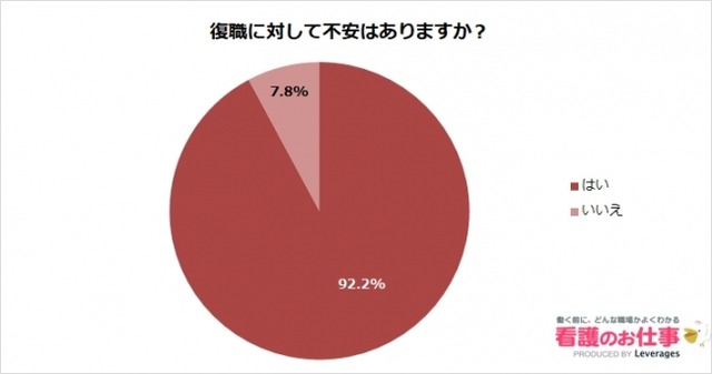「復職に対して不安があるか」の問いに、「はい」と答えたのは92.2%。離職中の看護師の大部分が、復職に不安を感じていることが明らかになりました。