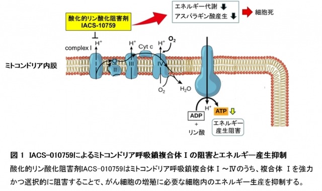 まず、がん微小環境においてがんの生存を助ける低酸素誘導因子 (HIF1a) *3を抑える分子に着目して、新しい医薬品の候補となりう得る化合物薬剤のスクリーニングを開始しました。そして、その化合物の中から、 ミトコンドリア呼吸鎖複合体Iを標的とする酸化的リン酸化阻害剤のIACS-010759(*3)を選出しました。 次に、この阻害剤IACS-010759の抗がん作用について複数の培養がん細胞を用いて調べたところ、エネルギー産生に必要なアスパラギン酸(*4)を抑えて、がん細胞の増殖を抑制することを発見しました (図1) 。
