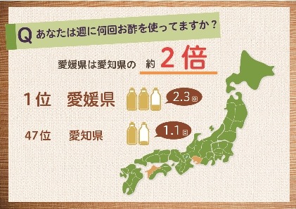 「あなたは、料理を作る時、1週間にどの程度お酢を使いますか。」という質問では、全国最下位がなんとミツカン創業の地である愛知県であることがわかり、逆にお酢使用頻度第1位は愛媛県という結果になりました。お酢使いNo,1であることが判明した愛媛県民の1週間のお酢利用回数は、お酢への関心が薄い愛知県民の約2倍なのです!