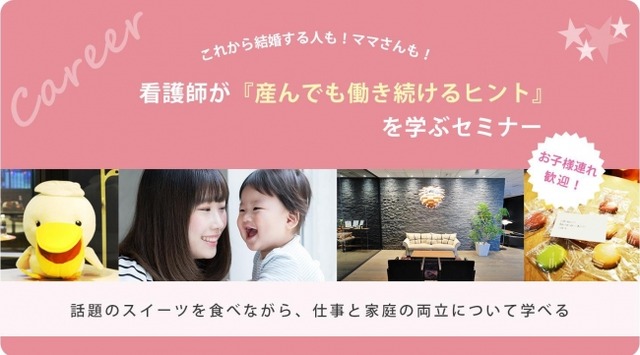 そこで「看護のお仕事」では結婚・出産したママナースが現場復帰し、仕事と家庭を両立させるための情報とノウハウを学ぶセミナーを開催。一人でも多くのママナースが復帰への悩みを解決し、 看護職に戻れるようなコンテンツを用意。当日はキッズスペースを設け、子供連れでも一緒に参加できます。