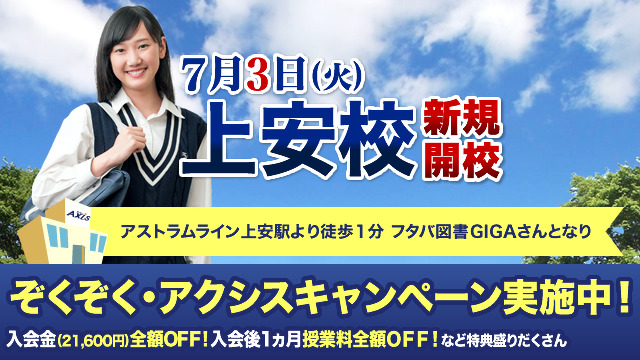 開校を記念し、特典をご用意しました。見学・学習相談は、いつでも承っておりますので、ぜひこの機会に「個別指導Axis上安校」をご利用ください。