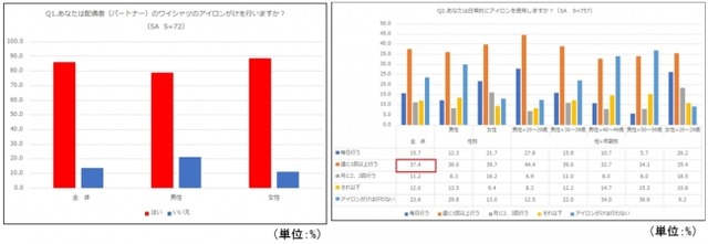 「あなたは配偶者(パートナー)のワイシャツのアイロンがけを行いますか?」と聞いたところ、8割以上がパートナーのワイシャツにアイロンをかけているという結果に。男性も約8割が経験。さらに、アイロンがけを『週に1回以上行う』人が一番多く37.4%。