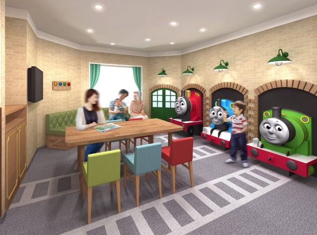 トーマスルームとは、「きかんしゃトーマス」の世界観あふれるキャラクタールームで、現在8つのお部屋があります。9つ目となる新ルームは、トーマスとなかまたちが集まる機関庫をテーマにした、トーマスルーム初のスイートルームタイプです。