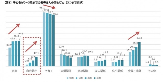 一方、「自分磨き」への関心は0歳(3.0%)から3歳(17.1%)にかけて約6倍に!