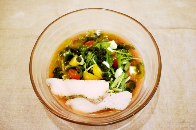 また、こだわりのトマトスープには今話題になっているサラダチキン、さらに野菜とモッツァレラチーズをトッピング。隠し味として、自家製のパクチー油がアクセントになっています。このパクチー油は、パクチーが苦手な人も食べられるように、子供から大人まで試食してもらいながら、改良に改良を重ねた自信作です。