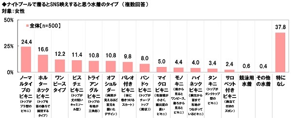 また、女性(500名)に、【ナイトプールで着るとSNS映えすると思う水着のタイプ】を聞いたところ、「ノーマルタイプのビキニ」が24.4%で最も多く、「ホルターネックビキニ」が16.6%、「ワンピースタイプ」が12.2%で続きました。