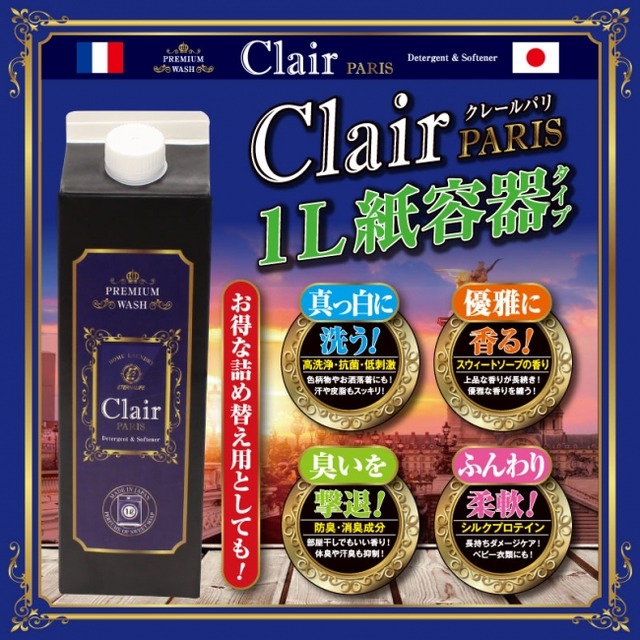 ヒロ・コーポレーション(福岡県北九州市)は、洗濯用柔軟剤入り洗剤「クレール・パリ(スイートソープの香り)」に1Lの紙パックを導入し販売を開始した。