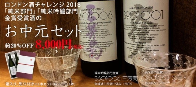 純米吟醸部門金賞「3601006 三芳菊(28BY)」、純米部門金賞「3901001 文佳人(28BY)」(各720ml 1本)をお中元セットにいたしました。