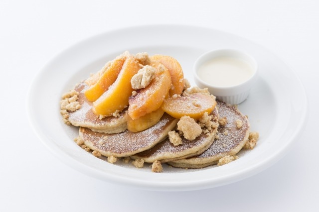 今回、ルミネ新宿店にて期間限定で登場する『ピーチクランブル パンケーキ』は、パンケーキの生地にマクロビフードなどによく使われる全粒粉を用いてヘルシーに仕上げ、オリジナルシロップに漬けたピーチのコンポートをトッピングしたスペシャル・パンケーキ。アクセントにサクッとした食感が特徴のクランブルを上から散らしています。まろやかなテイストのメープルクリームソースはピーチの甘酸っぱさと相性ぴったりです。
