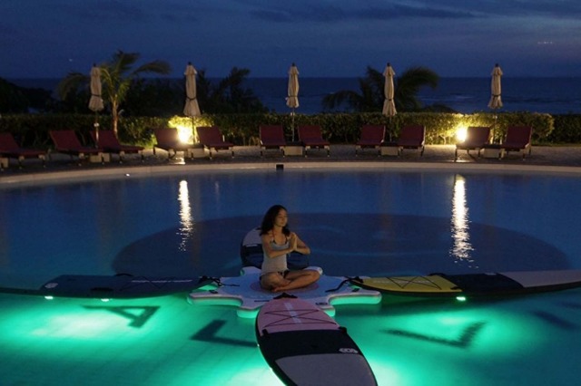 ハワイ発祥のウォーターアクティビティと言われるSUP(スタンドアップパドルボード)のボードを利用しての水上ヨガ。水上でヨガを行うことで、体幹への運動効果が高く、波のゆらぎでより深いリラックス効果が得られるとされています。遊泳時間終了後の静かなトワイライトのガーデンプールで、波の音や潮風、自然を感じながらリゾートならではのヨガが体験できます。