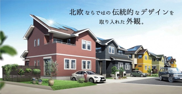 北欧を思わせる屋根形状と外壁、大胆かつスタイリッシュな色使いと太陽光パネル設置の邸宅デザインが特徴。鮮やかではあるもののどこか落ち着きのある街並みを演出します。また、シンボルツリー等の緑や木調のアクセントポールなども、街として調和の取れた景観を作り出します。