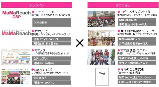 「オンライン」と「オフライン」の双方から、独自のネットワークとノウハウで子育て中のママたちにアプローチし、“ママのこえ”を集めたり、ママたちに情報を配信します。