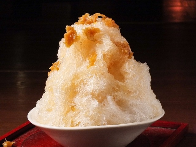 きめ細かく氷を削り、ふわふわ食感のかき氷にかけるこだわりのシロップは自家製の2種類。生姜屋 黒兵衛のメインの食材でもある生姜を使ったさっぱり系「アップルジンジャーティー」と、甘党絶賛、流行りのスイーツ系「ほうじ茶キャラメル」です。