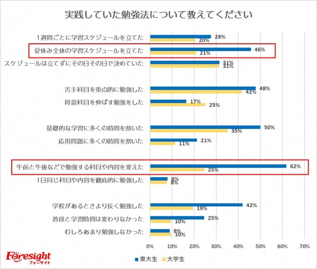 「夏休み全体の学習スケジュールを立てた」と答えた割合が東大生は高くなっています。