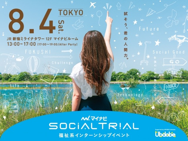 株式会社マイナビ(本社:東京都千代田区、代表取締役社長:中川信行)が運営するインターンシップ・就職情報サイト『マイナビ2020』(https://job.mynavi.jp/2020/)とNPO法人Ubdobe(本社:東京都世田谷区、代表理事:岡勇樹)の共同制作により、大学院・大学・短大・専門学校生・外国人留学生の全学年向け福祉系インターンシップイベント『マイナビ SOCIAL TRIAL(ソーシャル・トライアル)』を8月4日(土)に初開催します。