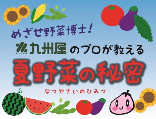 今回は、夏休みの特別講座として九州屋のバイヤーが、プロならではの夏野菜の知識を楽しくレクチャーします。『めざせ野菜博士!九州屋のプロが教える夏野菜の秘密』というタイトルで、各回45分・1日5回、各回8名(お子様の人数。保護者の参加が必須)を対象に開催します。