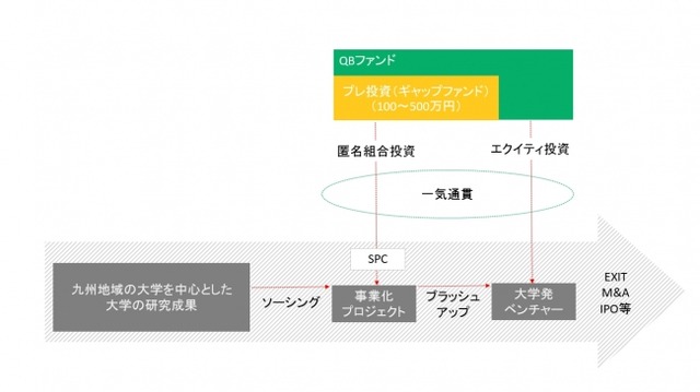 プレ投資プログラムとは、大学発ベンチャーの課題の一つといわれる研究費と民間投資の間にある資金的ギャップを埋め、地域において有望な大学発ベンチャーの創出を目指す「QB 第一号投資事業有限責任事業組合(略称:QB ファンド)」独自の大学発ベンチャーインキュベーションプログラムで、会社設立以前の事業化プロジェクトに100~500万円/件の資金提供を行います。その資金を元に、プロジェクト期間中(半年~1年)に、POC(Proof of Concept)や経営人材の探索を行い、大学発ベンチャーの創出に繋げます。