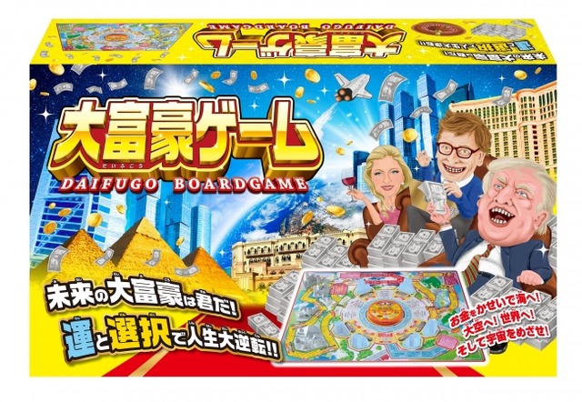 「大富豪ゲーム」は、ルーレットを回して出た目の数だけ進みながら、大富豪を目指すボードゲームです。自分のコマを自転車→リムジン→クルーザー→ジェットとグレードアップさせながら、会社経営や、株券の所有などで資産を増やしていきます。乗り物コマのグレードアップに応じて、ゲームのルートもハワイアンルート、世界周遊ルート、そして宇宙ルートへと広がっていきます。ゲーム終了時点で最も多くのお金を多く持っていたプレイヤーの勝ちです。宝さがしやカジノなど、運と選択で大逆転も狙えます。