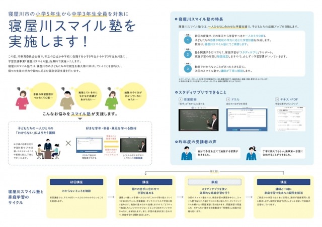 株式会社リクルートマーケティングパートナーズは、寝屋川市(大阪府)より委託契約を受け、学習支援の取り組みを2018年5月より開始しました。支援は、市内の中学生(1,2,3年生全員)と小学生(5,6年生のうち希望者)を対象に、家庭での学習習慣の定着を目的とした学習面でのサポートを行うものです。