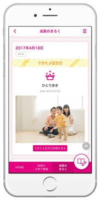 育児日記として使用できる「できたよ記念日」は、厚生労働省の母子健康手帳様式例などを元に作成し、母子健康手帳の「保護者の記録」を含む発達段階や子育てにかかわる記念日を写真やメッセージと共に記録できるだけでなく、子どもの成長・発達の目安としての役割も備えています。