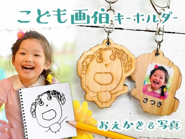 国産ヒノキのプレートの片面にお子さんの絵をレーザー彫刻し、その反対面にはお子さんの顔写真とお名前を高画質プリントします。製作期間は1週間前後。完成キーホルダーがお届け先に届きます。