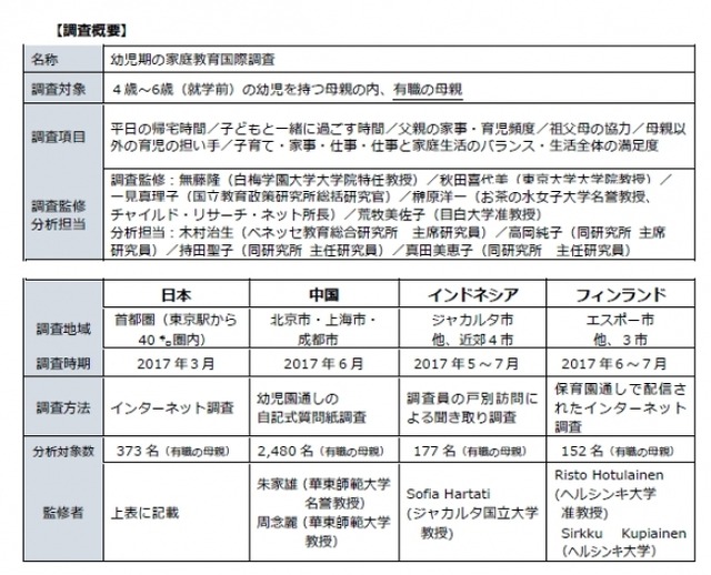 株式会社ベネッセホールディングスの子会社、株式会社ベネッセコーポレーション(本社:岡山市)の社内シンクタンクであるベネッセ教育総合研究所は、2017年に日本・中国・インドネシア・フィンランドの都市圏で、幼児期の子どもを持つ母親を対象に「幼児期の家庭教育国際調査」を実施しました。本年3月には、小学校入学に向けて幼児期に育みたい力として設定した《学びに向かう力》と保護者のかかわりについて報告しました。今回は分析第二弾として、働く母親・父親のワーク・ライフ・バランスの実態について報告いたします。