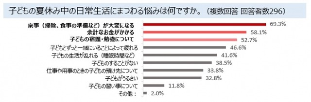 「子供の夏休み中の日常生活にまつわる悩みがありますか」と質問したところ、7割以上のママが、「ある」と回答しました。その内容は、1位「家事が大変になる(69.3%)」、2位「余計なお金がかかる(58.1%)」、3位「子どもの宿題・勉強について(52.7%)」で、どれも50%を超えています。半数以上のママたちが、夏休み中に「家事」「お金」「子どもの勉強」にまつわる、同じような悩みを持っているということがわかります。