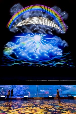 入園すぐのエントランスホールでは、切り絵作家・酒井敦美氏による光の切り絵「空と海と夏」が来園者を出迎え、一気に幻想的な世界へと誘う