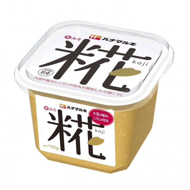 近年のみそ市場における消費者の「本格志向」と「健康志向」の高まり、また、こうじを使用した甘酒のブームによる「こうじ」の健康イメージの高まりにより、「こうじみそ」が伸長しています。ハナマルキでは、新たにこうじの甘みと大豆の旨みが調和したまろやかな味わいの10割こうじみそ「生みそ糀750g」を発売します。パッケージデザインは、白を基調とし、「糀」の文字を大きくあしらうことでこうじの健康イメージを訴求しました。