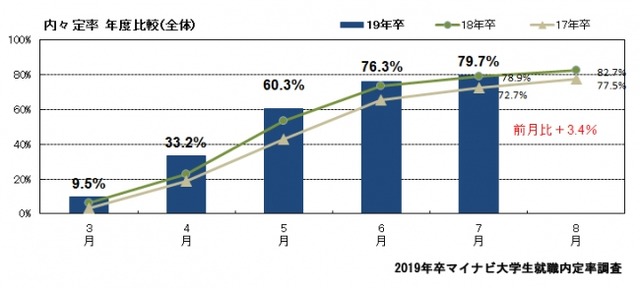 ■ 2019年卒業予定大学生、大学院生の7月の内々定率は79.7%(前年同月比0.8pt増)