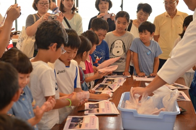 次に、凍った柵の解凍方法を、実演を交えながら紹介。ネタが水っぽくならないよう、35℃~38℃の水に塩を加えた「温塩水」を使っていると解凍時の秘密を話しました。普通の水で解凍した時のネタと温塩水で解凍した時の違いを知るため、ネタの色や触感などを比較しました。違いは一目瞭然で、温塩水を使った方のネタは赤く発色しドリップも少なく、綺麗な状態で提供可能だと述べました。温塩水の最適な温度や家での実践方法など、保護者の方も積極的に質問をしていました。ネタの秘密を学んだ後は、実際のまぐろの柵を使ってネタの切りつけを披露。野菜を切る時のようにまっすぐ包丁を下ろすのではなく、斜めの角度から包丁を引いて切るのだとコツを紹介しました。柵から次々と切りつけられるネタと担当者の包丁さばきを、子供たちはキラキラした目で観察していました。