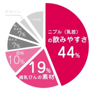 ■調査項目:哺乳びんの素材、ニプル(乳首)の飲みやすさ、洗いやすさ、サイズ、価格、デザイン、その他