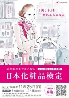 本日8月8日、一般社団法人 日本化粧年検定協会(東京都中央区/代表理事:小西さやか https://cosme-ken.org/)は、2018年11月25日(日)開催の第11回日本化粧品検定の受付を開始したことをお知らせいたします。札幌・仙台・東京・静岡・名古屋・京都・大阪・福岡の8会場の他、特別会場として新たに秋田・高崎・水戸・さいたま・長野・岡山・高知・鹿児島の8会場、計16会場で検定を開催いたします。(特別会場のうち、水戸を除く7会場では初開催)