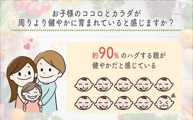 「ご自身のお子様のカラダ・ココロが、 同年代の子どもに比べて健やかに育まれていると感じますか?」と質問をしたところ、「子どもにハグをしている」親は、「とても感じる」(42.5%)、「やや感じる」(46.1%)と実に88.6%の親が、自分の子どもが健やかに育っていると答えています。
