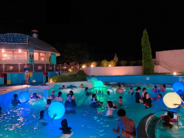<内 容> 夜の屋外プールは、おしゃれなナイトプールに変身。カラフルなボールを浮かべ、幻想的な雰囲気を演出します。