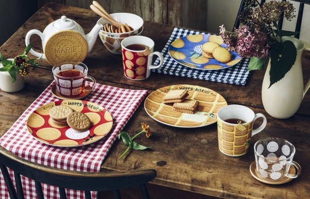 プレートの柄は、本物のビスケットと同じサイズ。プレートの白い部分にビスケットを載せればイラストが完成。プレート¥756、タンブラー¥540、コースター¥648
