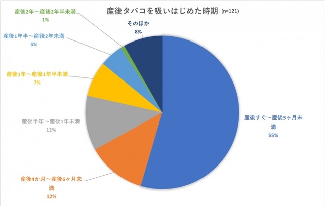 妊娠出産を機に禁煙したが産後喫煙を再開したママは、喫煙経験のあるママの15 %に当たる121名でした。