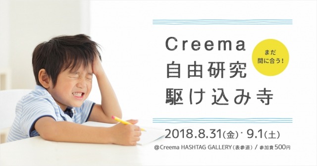 日本最大級のハンドメイドマーケットプレイス「Creema(クリーマ)」を運営する株式会社クリーマ(本社:東京都渋谷区、代表取締役社長:丸林耕太郎、以下クリーマ)は、「夏休みの自由研究がまだ終わっていない!」「思わぬハプニングで自由研究が台無しになってしまった!」そんな悩みを抱える小学生を対象に、Creemaの人気クリエイター4名とクリーマ代表の丸林による、夏休みの自由研究が1日で終わるワークショップ「Creema 自由研究-駆け込み寺」を、2018年8月31日(金)、9月1日(土)の2日間に渡り開催いたします。