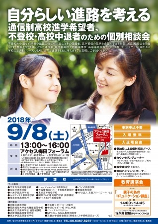 不登校や中退など学業や進路に悩む小中高生とその保護者、高卒資格の取得を希望する方を対象に個別相談会を開催いたします。関西エリアを中心とした通信制・単位制高校や技能連携校、高等専修学校、サポート校、フリースクール、寮のある学校などが集い、一人ひとりに合った進路をともに考えます。お気軽にご参加ください。