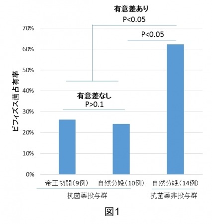 乳児腸管内へのビフィズス菌の定着は分娩様式(帝王切開か自然分娩か)の違いよりも、分娩直前の抗菌薬投与により大きな影響を受けていた。