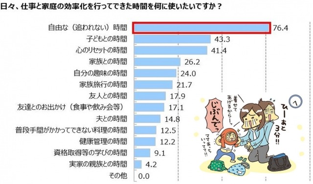 自由な(追われない)自分の時間として使いたいという回答が群を抜いて高く、日々時間に追われるママたちのストレス・プレッシャーの高さを感じさせる。