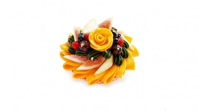 バラに見立てた濃厚なマンゴーと、甘くみずみずしいイチジクを、宇治茶「祇園辻利」の抹茶を合わせたモンブランクリームとともに、カスタードのベースに飾りました。花束をイメージして見た目の配色にもこだわり、華やかで上品なケーキに仕上げています。